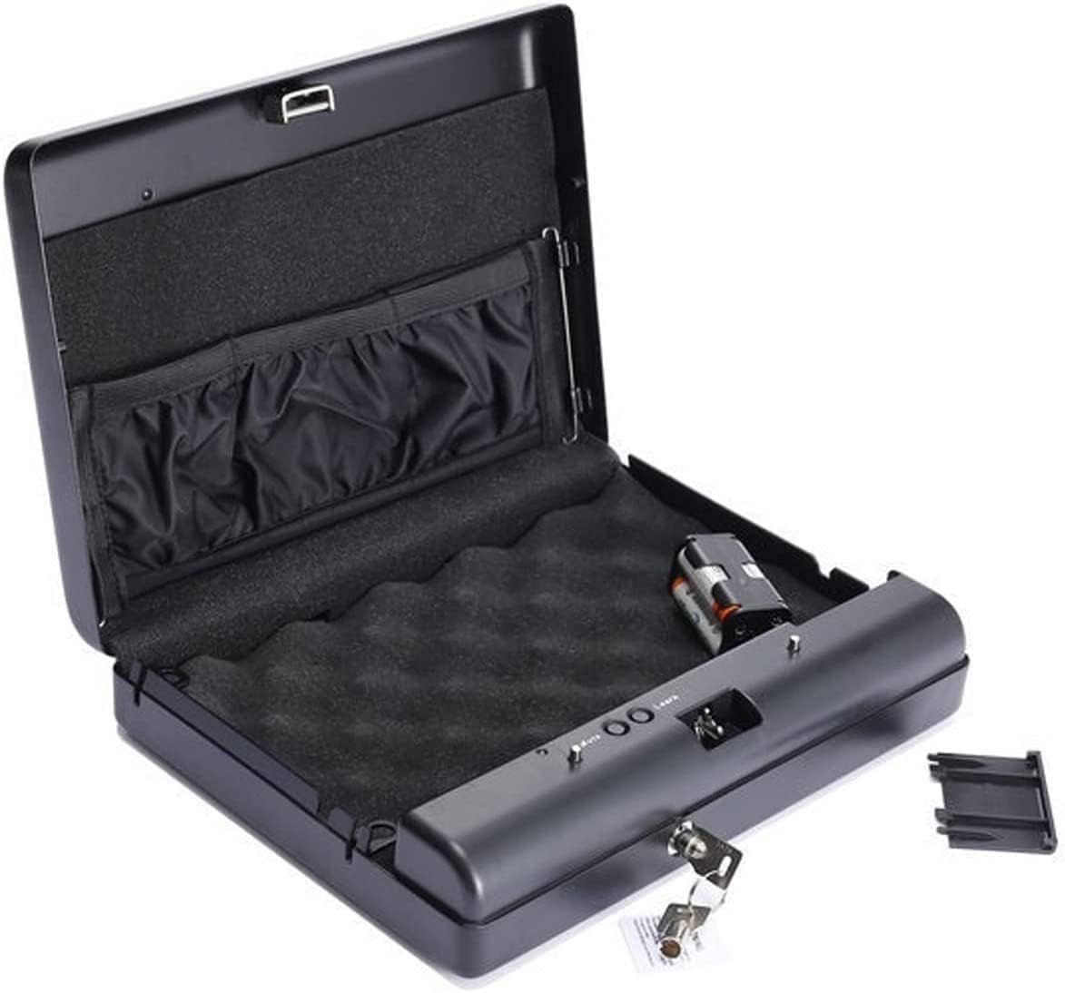 Coffre-fort conçu pour sécuriser les armes à feu des enfants et des intrus. Fabriqué en tôle d'acier laminée à froid pour une meilleure résistance. Le coffre dispose de deux méthodes de déverrouillage : par empreinte digitale et par clé de rechange. Équipé d'une corde en acier inoxydable pour fixation, il contient également de la mousse à mémoire de forme pour protéger son contenu.